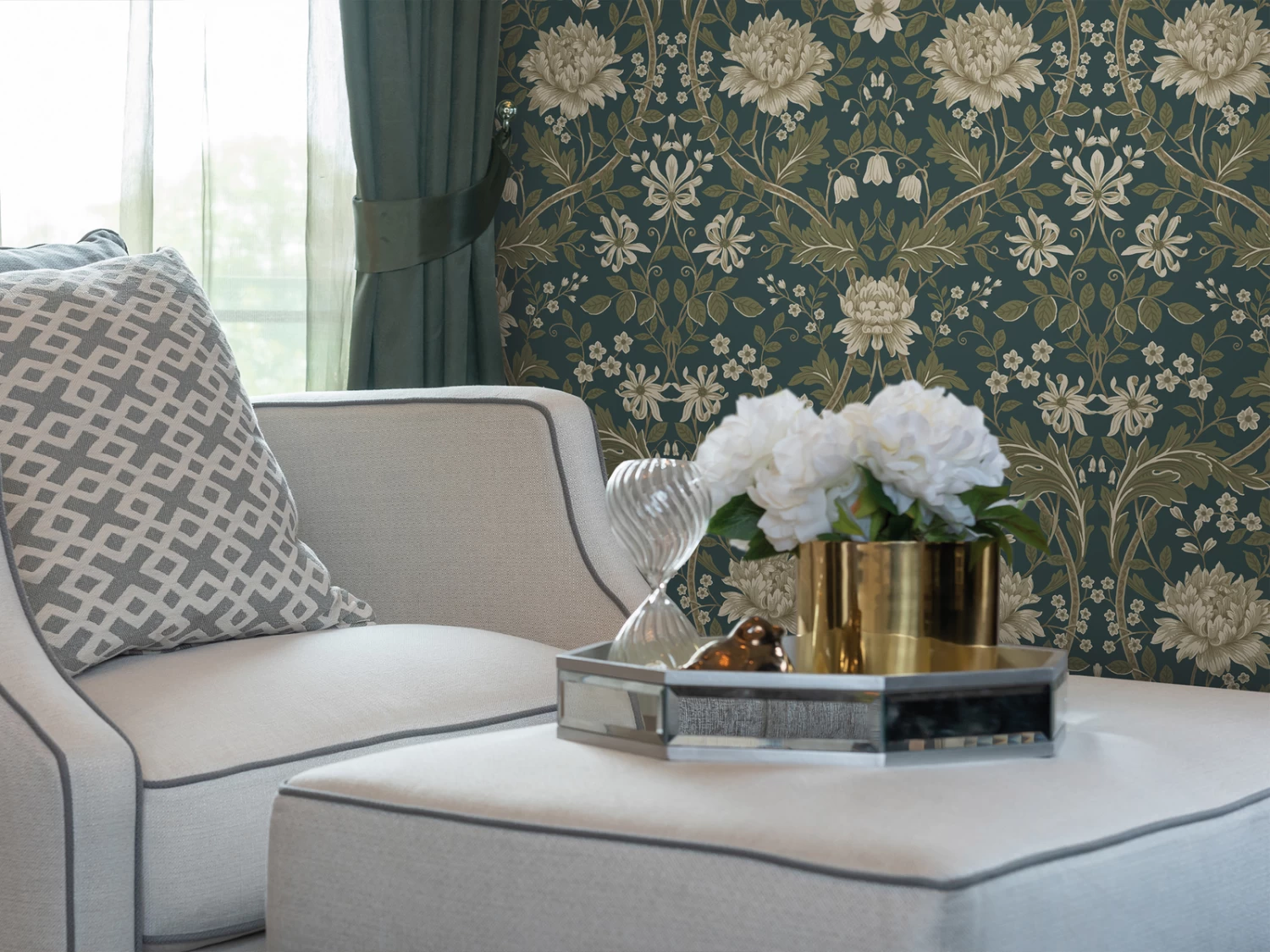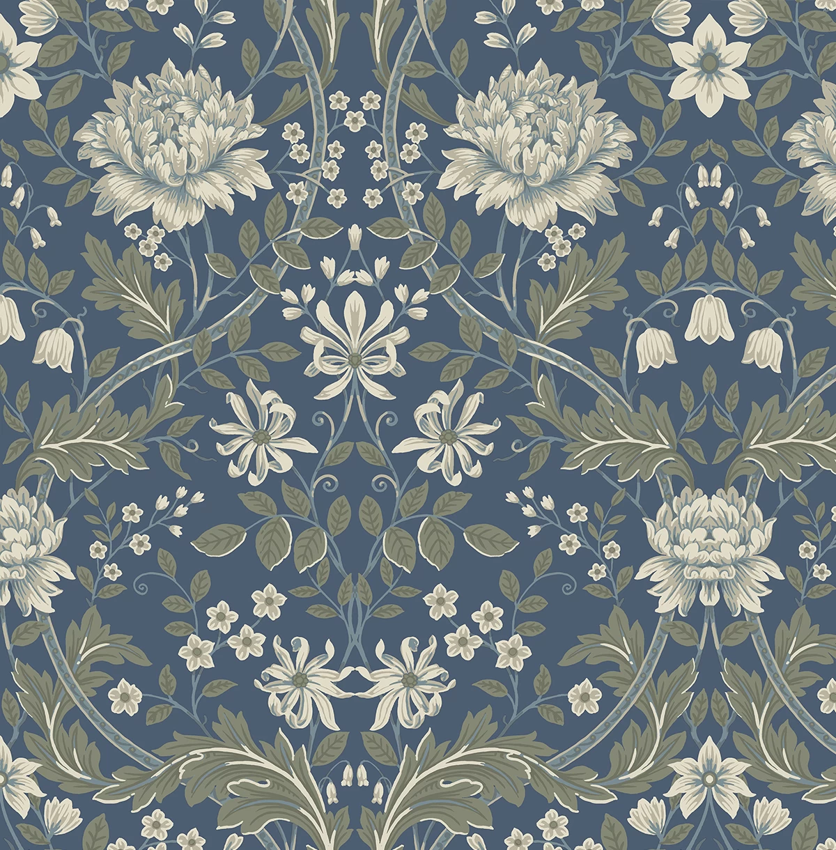 A design taken from the Arts & Crafts era. Deep muted tones throughout this colour palette. Similar to the William Morris style. This large damask in blue, green, off white/neutral and grey/taupe tones.