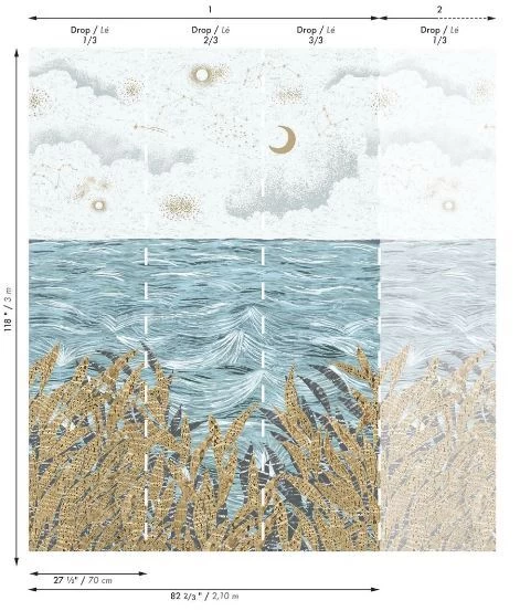Three 70cm by 3m panels. Total size of 210cmx3m. Horizontally repeatable wallpanel.
