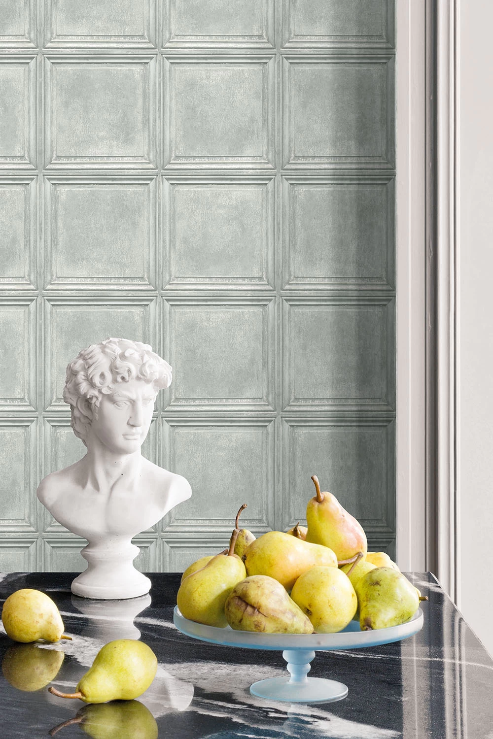 Faux 3D wood panels.