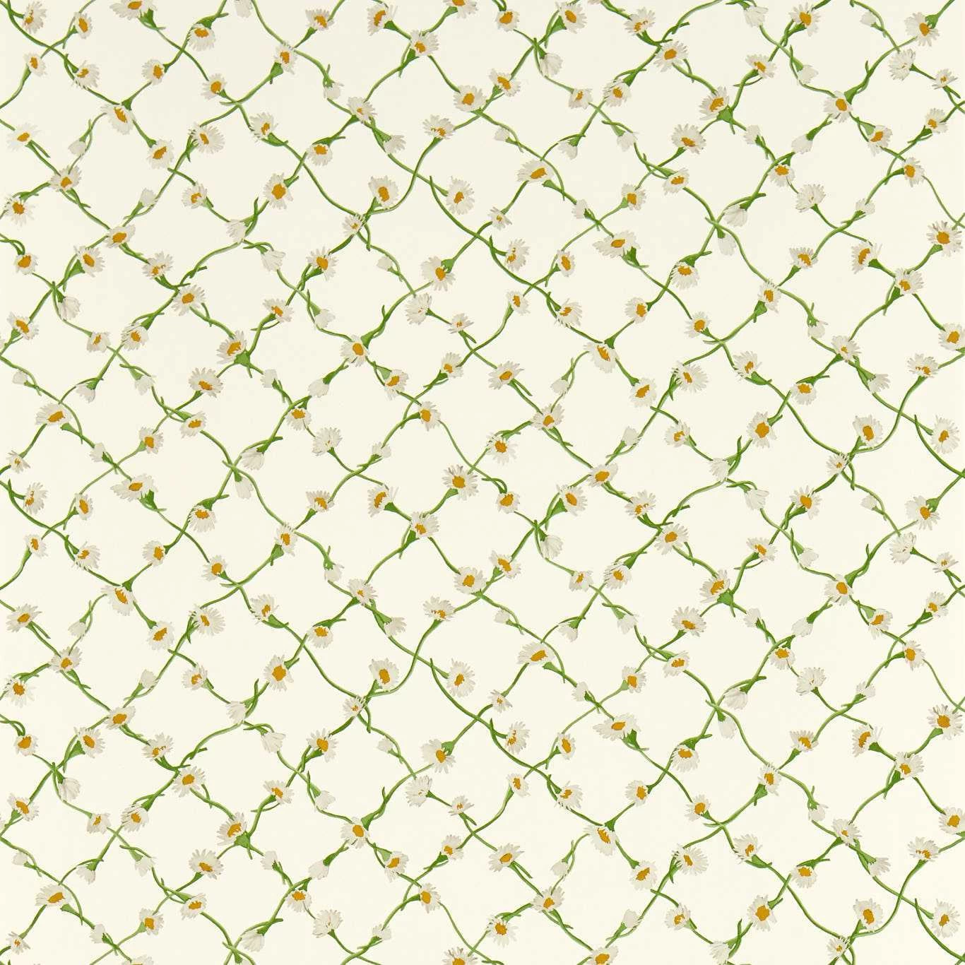 Charming daisies, picked from the garden and hand painted in the studio, link together to create this pretty trellis wallpaper, which retains the intricate detail of each individual flowerhead. The Emerald/Pearl colourway features a soft white background with daisies connected by green flower stems.