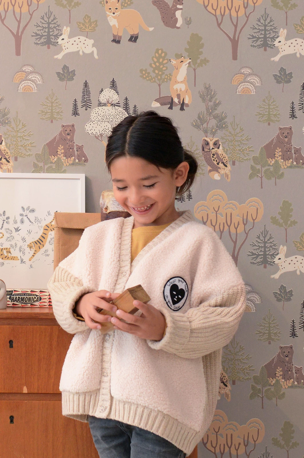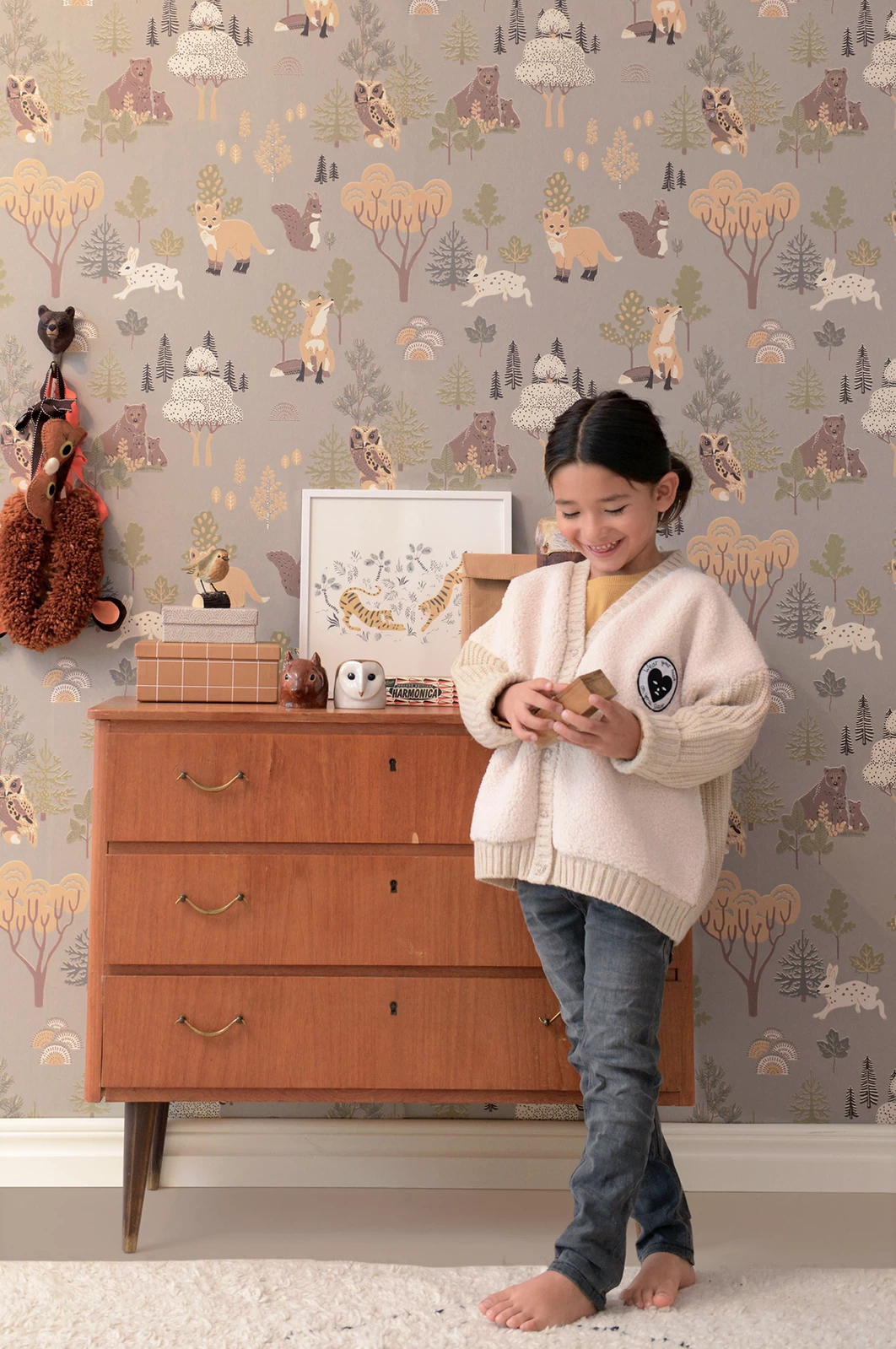 The Deep Forest is a mystical depiction of all things seen in the woods. Bears, bunnies, foxes, owls, and foliage are placed together in a motif style, giving a whimsical and enchanting feel. The Mystic Grey colourway features a warm grey background with woodland elements in shades of brown, green, and soft orange.