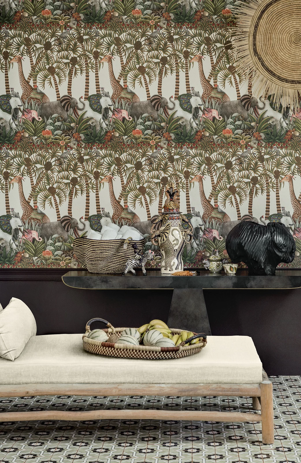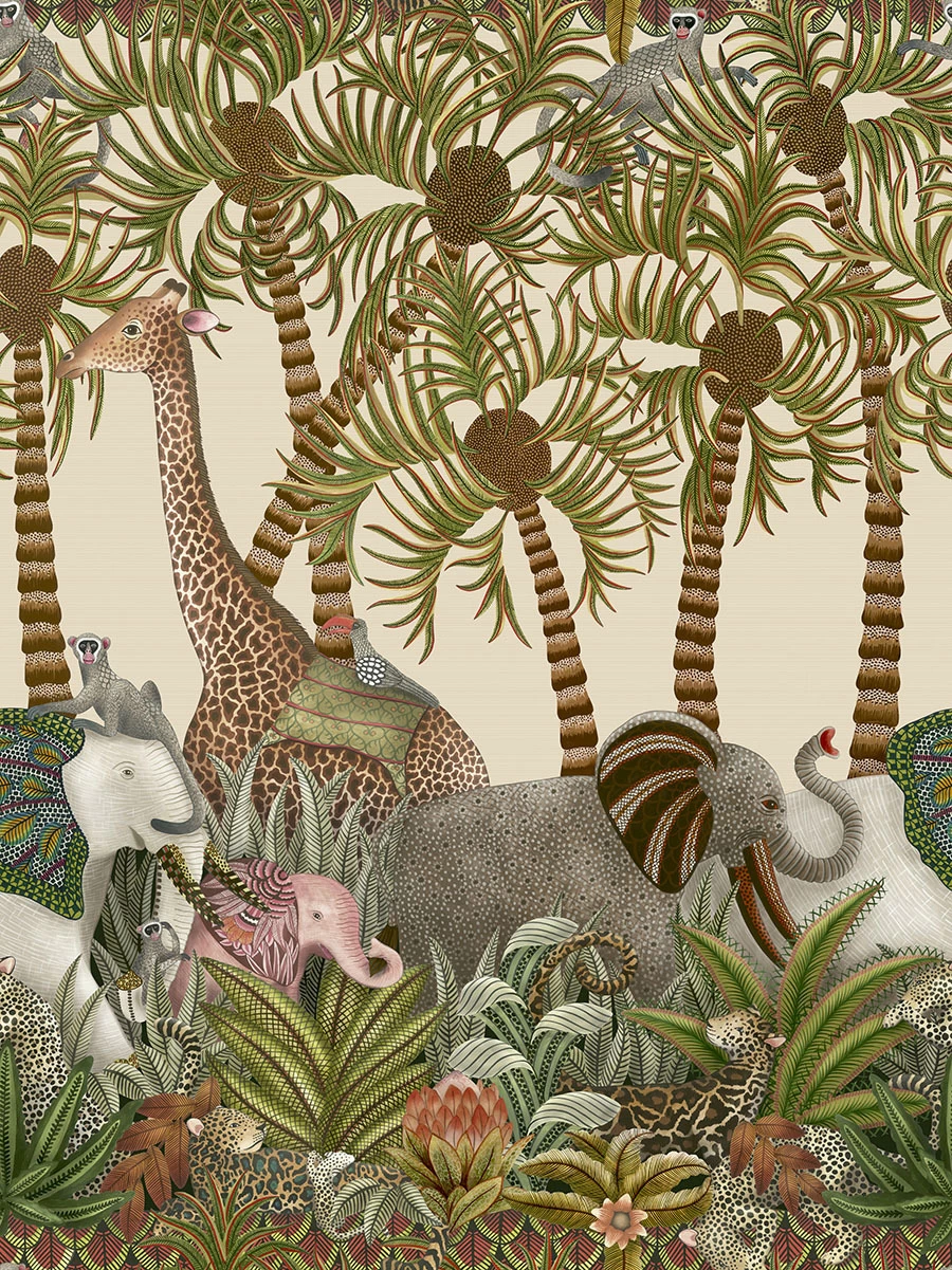 Every inch of this expansive design is brimming with vibrant pattern and colour. The elephants’ large ears, tusks and even hides are treated to festive embellishment reminiscent of Zulu beadwork, creating an artwork within the wider design. Its lively rhythm abounds with Lala Palm fronds crowning the design with their dense canopy.