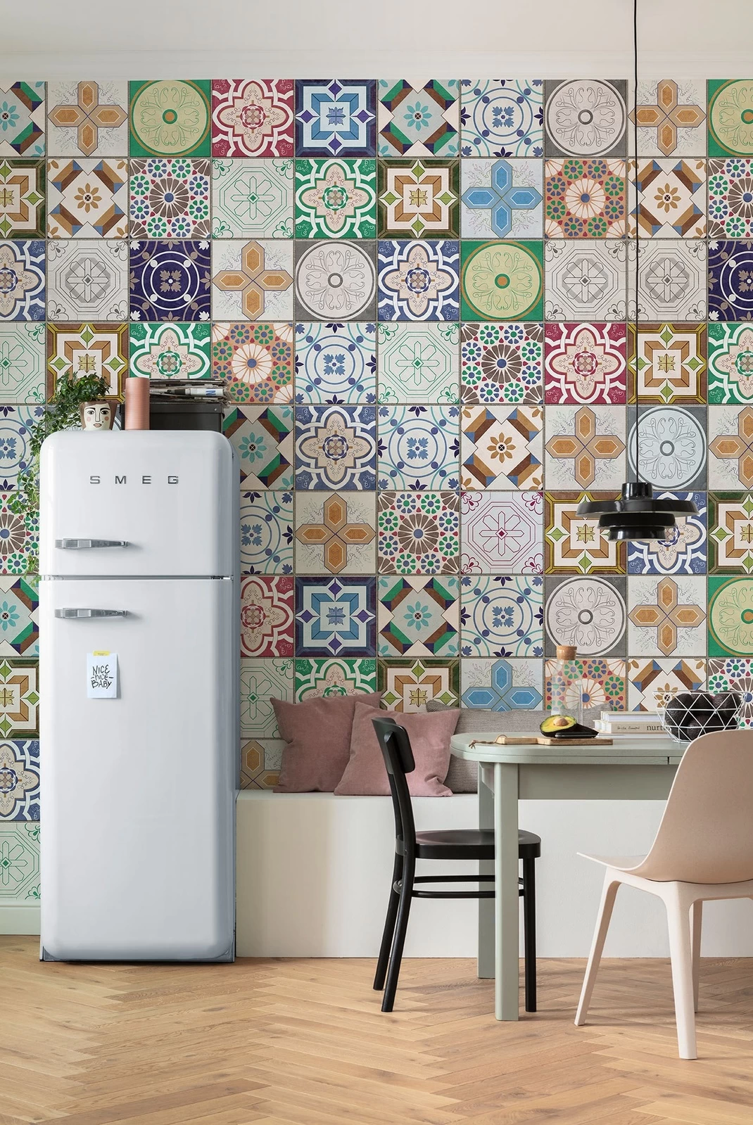 The beautiful mixed tile pattern effect is now available on a mural. The colourful patterns are reminiscent of Moroccan tiles and create an oriental ambience.