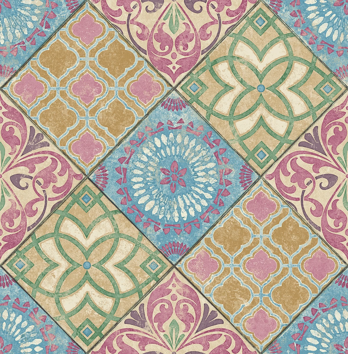 distressed federation tile look wallpaper in soft blue, pink, mustard and green