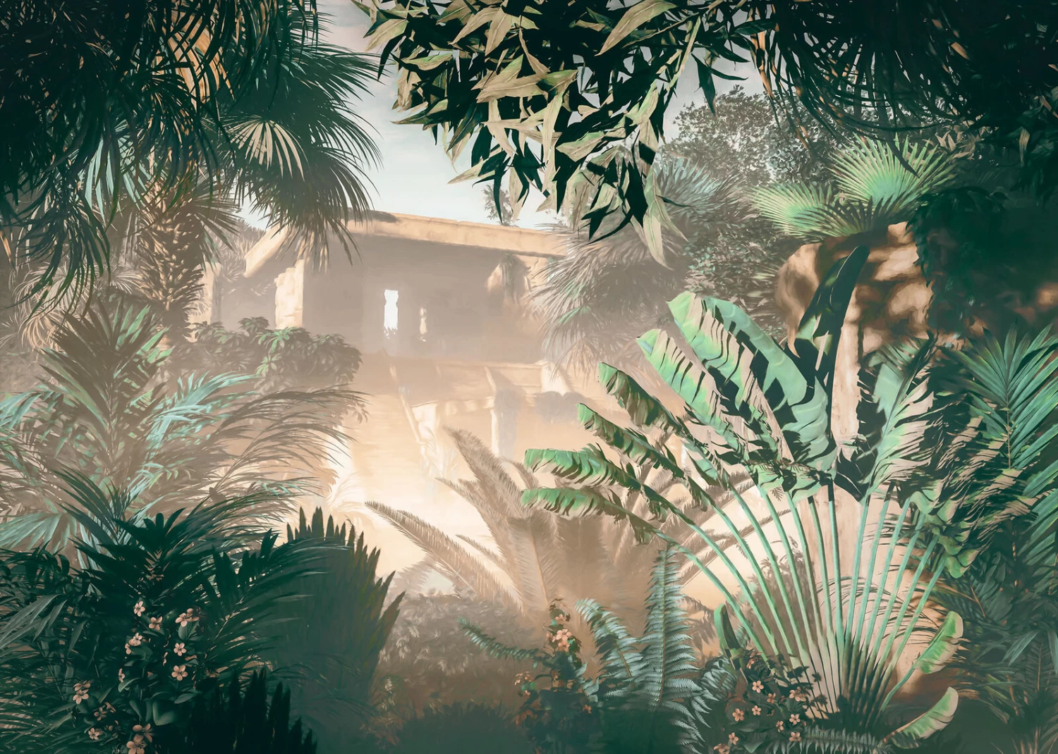Framed by plants and enveloped by a play of light and shadow, a magnificent abandoned building rises into the sky, or perhaps it’s a mirage?