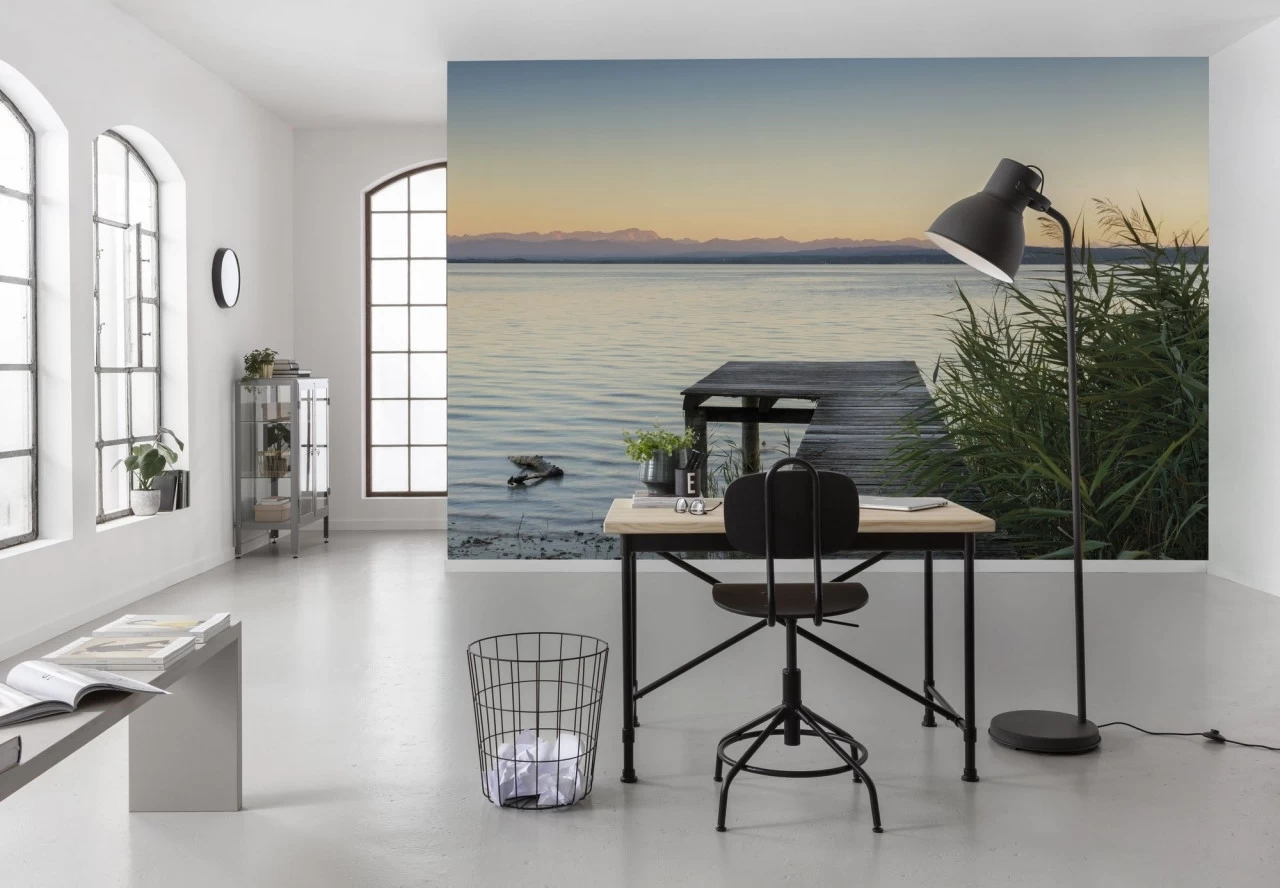 Peaceful in the evening light, Ammersee lake offers a magnificent view of the Alps on the horizon.