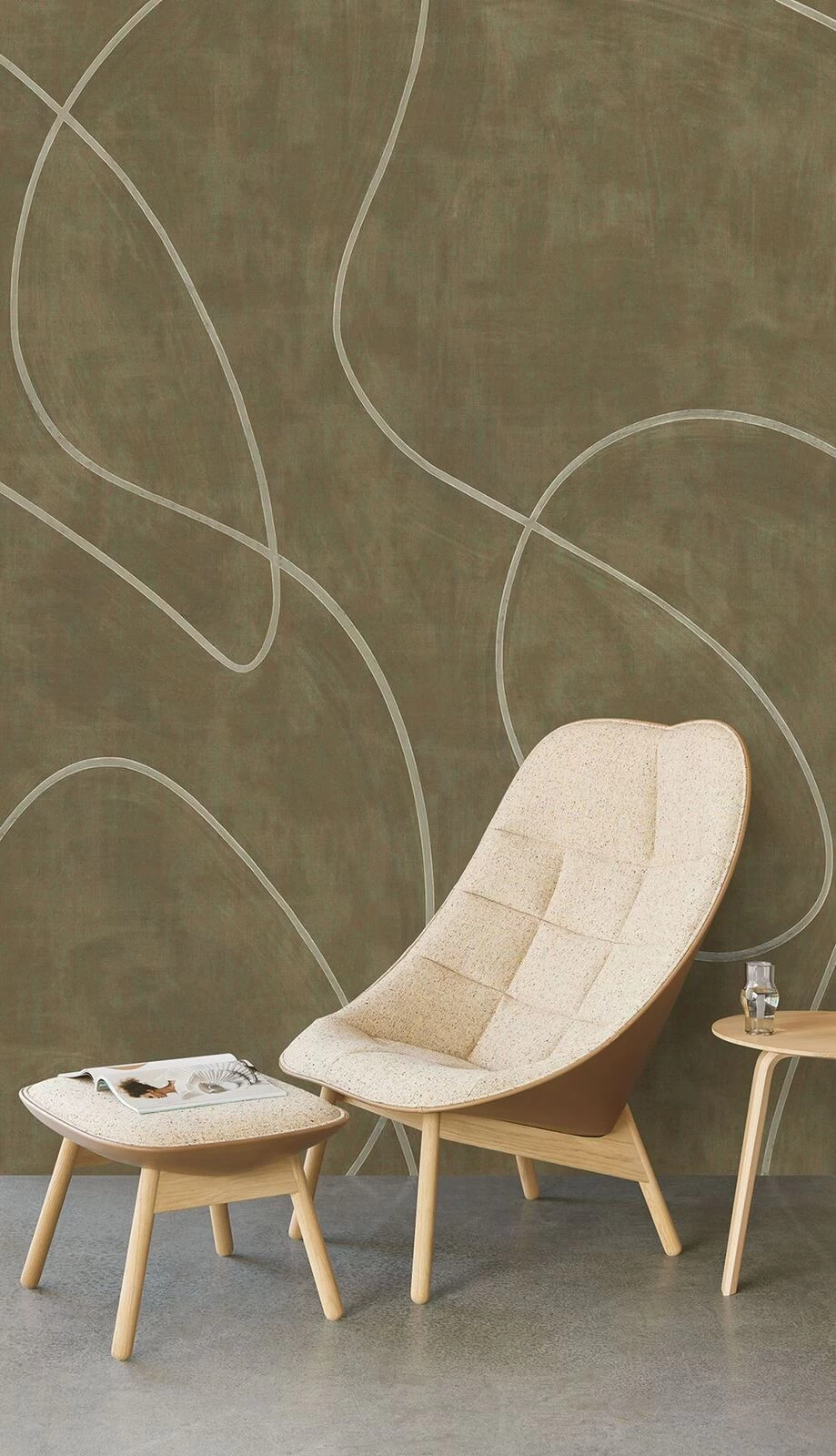 Non-woven wall mural with a gracefully meandering line on a roughly painted background. Natural lines and textures in soft neutral tones, making for a simple artistic design.