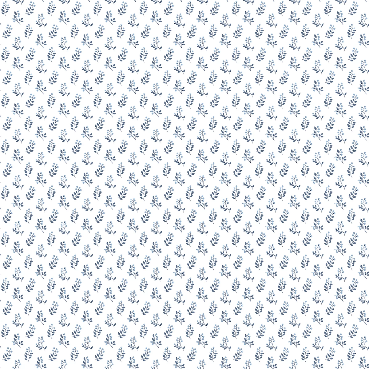 The Vintage Bud design by Galerie features a simple fern motif in an alternating pattern. The simplicity of this design is reminiscent of vintage wallpaper styles. The Blue colourway features a white background with blue toned leafy-ferns.