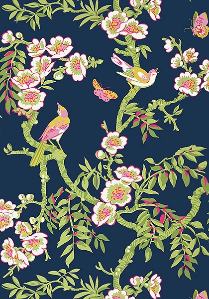 Flowers, birds and butterflies adorn this wallpaper, complimented by Thibaut’s signature colour palette.